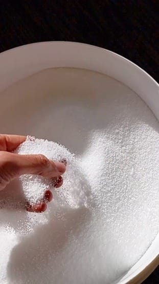 Hand schept witte kaarsenparels uit een kom – close-up van een hand die witte parelvormige kaarsenzand oppakt uit een ronde witte schaal. Het kaarsenzand heeft een fijne, korrelige structuur.